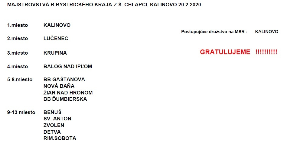 V dňoch 20.2. - 21.2.2020, (štvrtok a piatok) sa v ZŠ Kalinove konali MK BB kraja ZŠ.